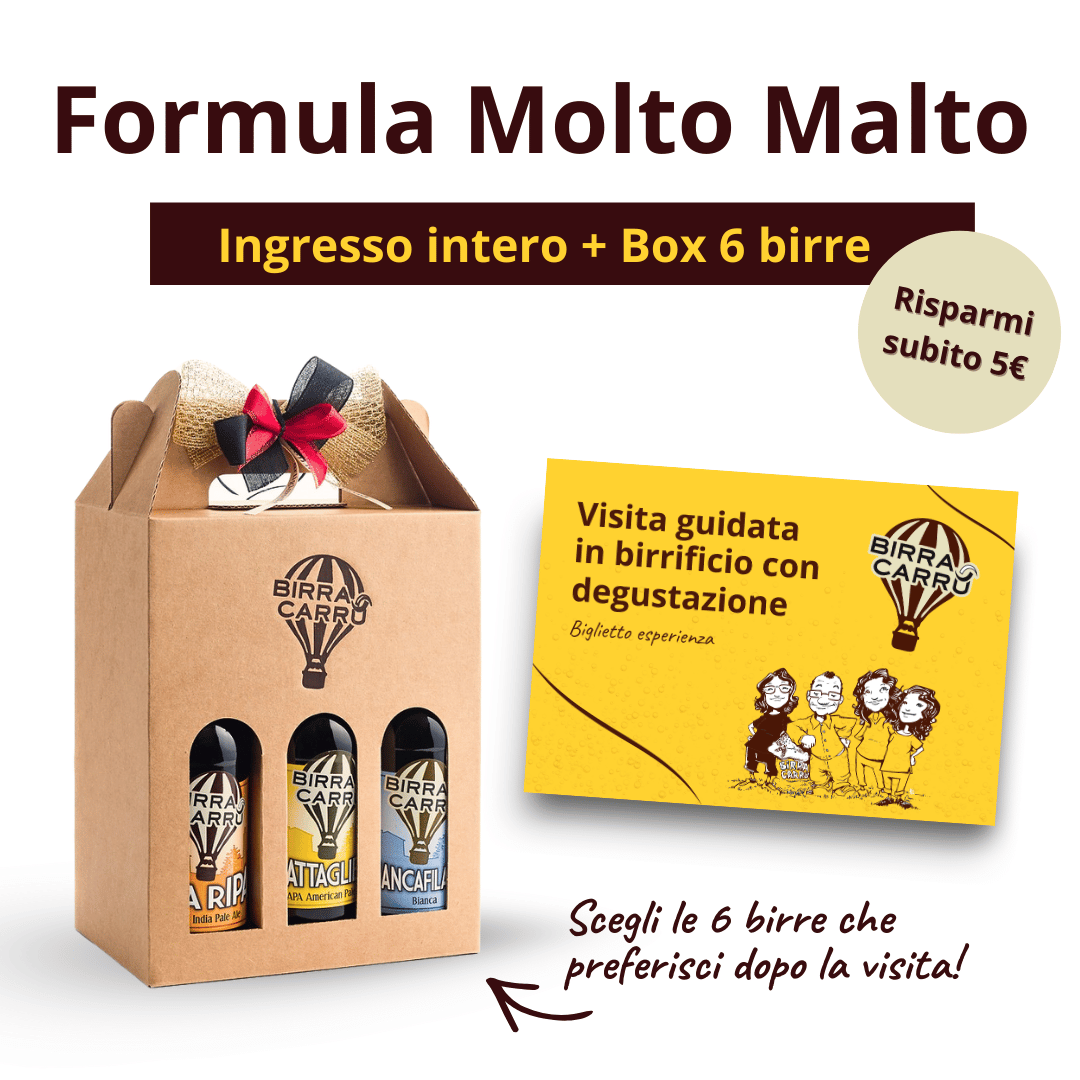 In entrambe le opzioni è compresa la visita con degustazione; nella Molto Malto c’è l’acquisto di una box da 6 birre da 33 cl scontata, che potrai scegliere come riempire al termine dell’esperienza, con le birre che ti sono piaciute di più o con quelle che vuoi provare.